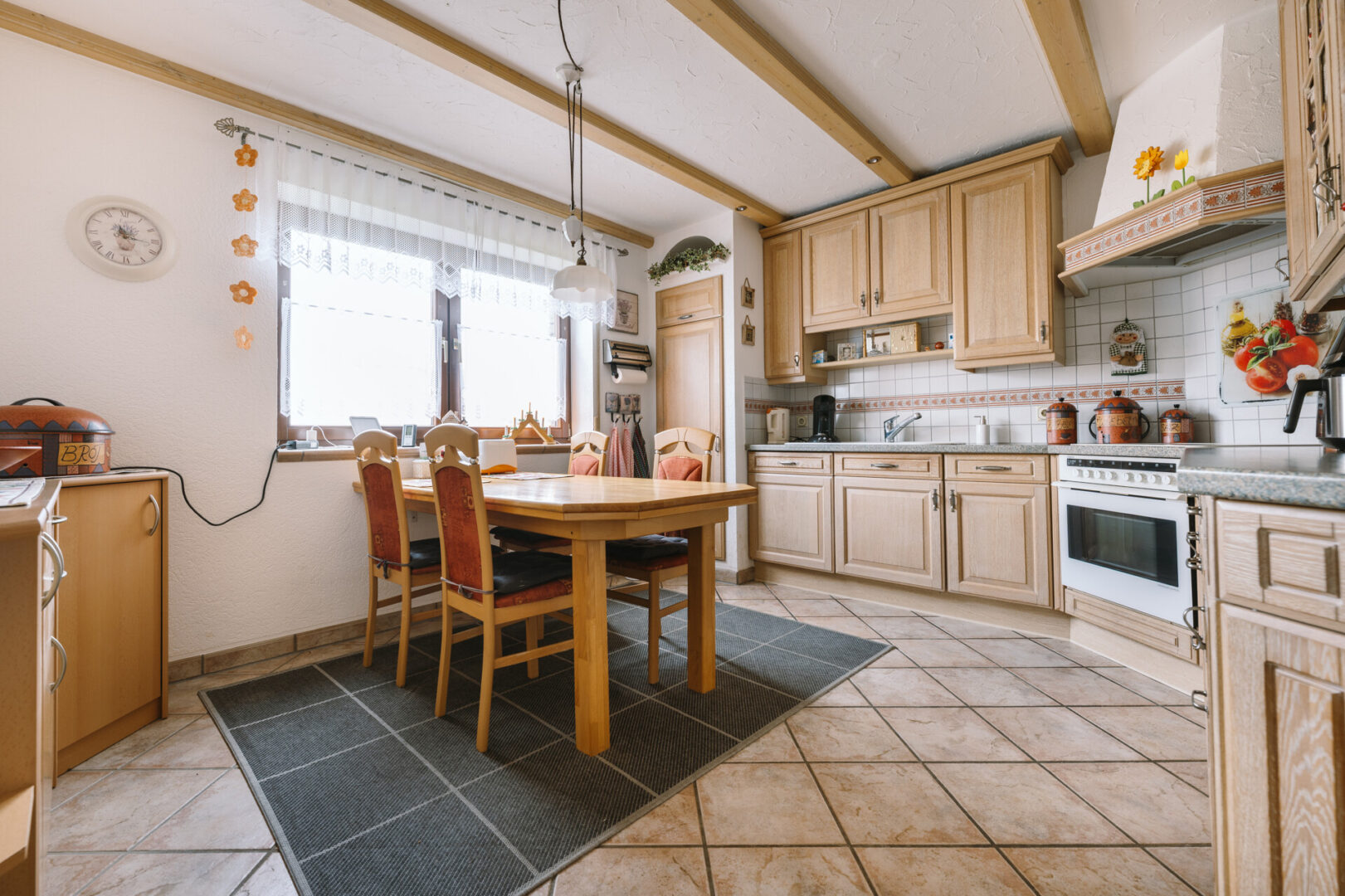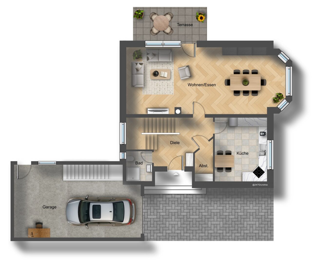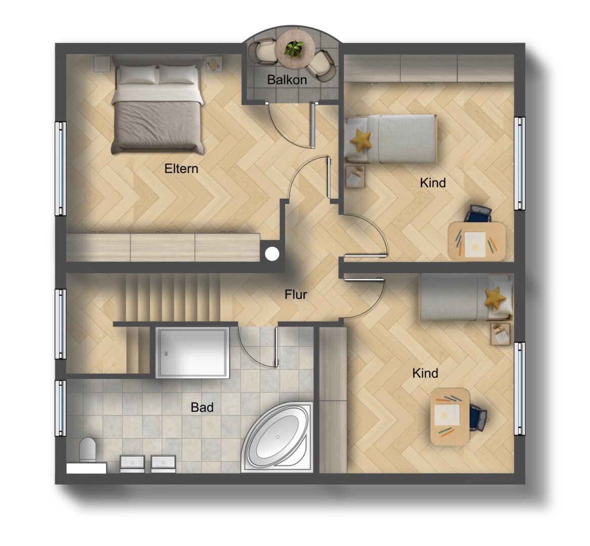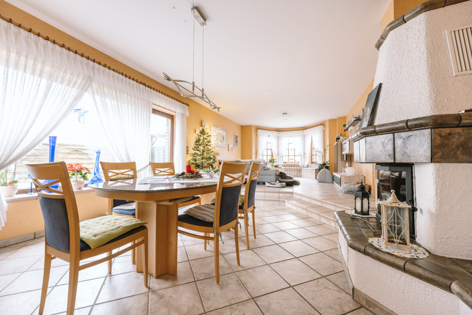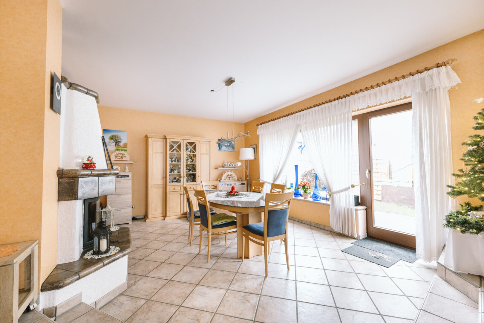 Im Erdgeschoss befindet sich der Mittelpunkt des Hauses: ein großzügiger Wohn- und Essbereich, der durch den Erker und den Kamin eine warme und einladende Wirkung erzeugt. Große Fensterflächen sorgen für Licht und einen angenehmen Übergang zum Garten. Direkt daneben liegt die geräumige Küche, die genügend Platz für gemeinsames Kochen und Vorratshaltung bietet. Ein Gäste-WC ergänzt das Erdgeschoss.