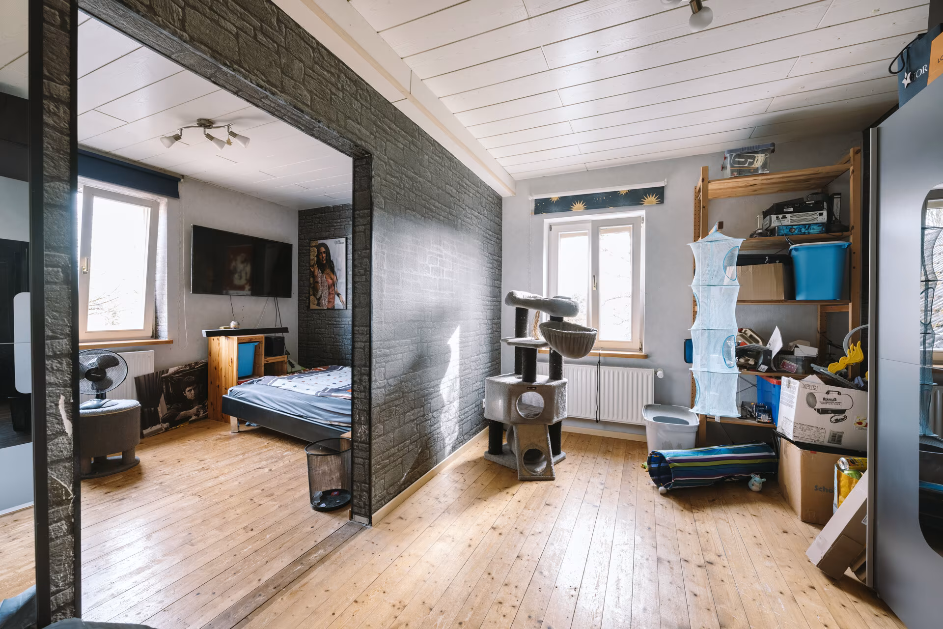 Insgesamt stehen sieben Zimmer zur Verfügung, darunter vier Schlafzimmer. Zwei Badezimmer sowie ein zusätzliches Gäste-WC verteilen sich auf die verschiedenen Etagen und sorgen für eine praktische Aufteilung im Alltag.
